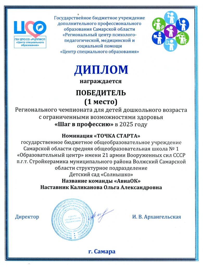 Команда Детского сада «Солнышко» п. г. т. Стройкерамика «АвиаОК» (наставник Каликанова Ольга Александровна) стала победителем Регионального чемпионата для детей дошкольного возраста с ограниченными возможностями здоровья «Шаг в профессию» в 2025 году в номинации «ТОЧКА СТАРТА» в профессии класса «Человек — техника»!