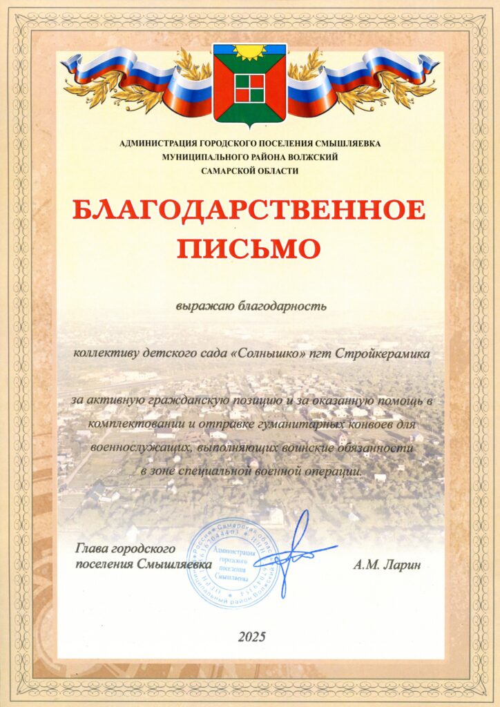 18 мая 2023 года в рамках ежегодного фестиваля «ПАТРИОТИЗМ И ОТЕЧЕСТВО» творческих педагогических коллективов образовательных учреждений м.р. Волжский Самарской области творческая группа СП «Детский сад «Солнышко» п.г.т. Стройкерамика представила на суд жюри и зрителей номер «Говорят погибшие герои» и заняла 2 место в номинации «Литературно-музыкальные композиция».