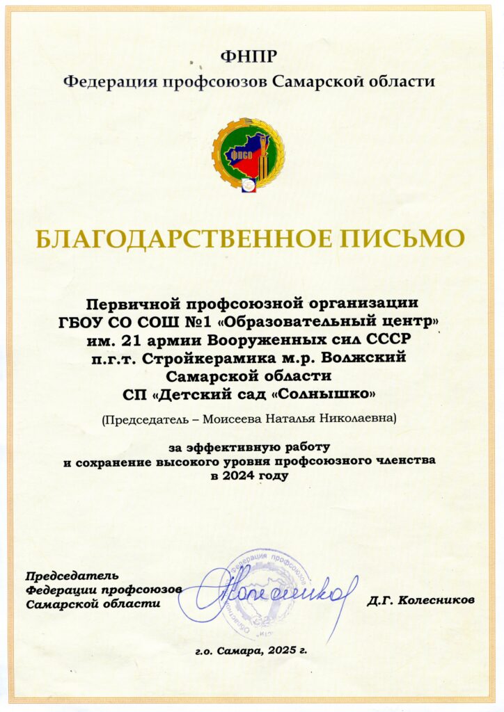 Коллектив «Детского сада «Солнышко» п.г.т. Стройкерамика стал Лауреатом II степени Самарского областного конкурса профсоюзной рабочей песни в номинации «Песня о профсоюзе», который прошел 19.10.2019 в ДК «Заря».