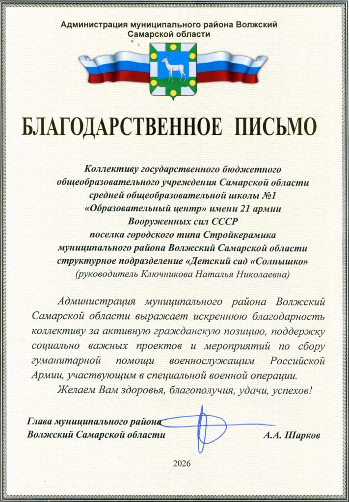02.04.2026г. коллектив структурного подразделения «Детский сад «Солнышко» п.г.т. Стройкерамика (руководитель Ключникова Наталья Николаевна) награжден Благодарственным письмом Администрации муниципального района Волжский Самарской области за активную гражданскую позицию, поддержку социально важных проектов и мероприятий по сбору гуманитарной помощи военнослужащим Российской Армии, участвующим в специальной военной операции.